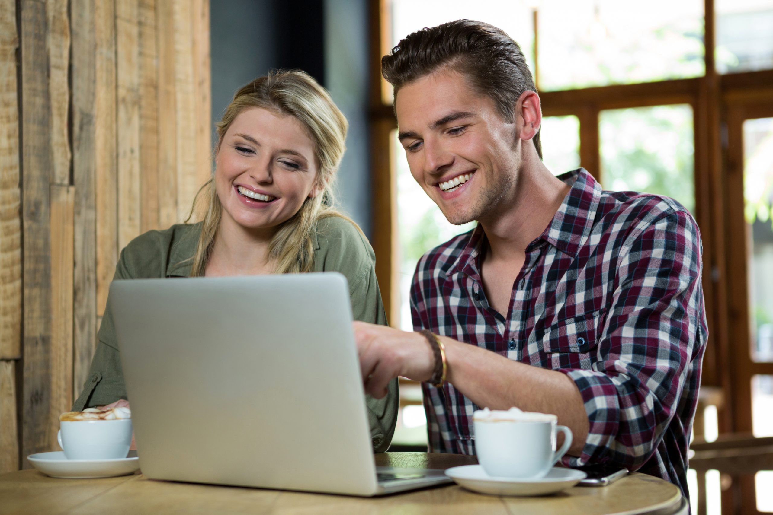 Cheerful young couple using laptop at table in coffee shop